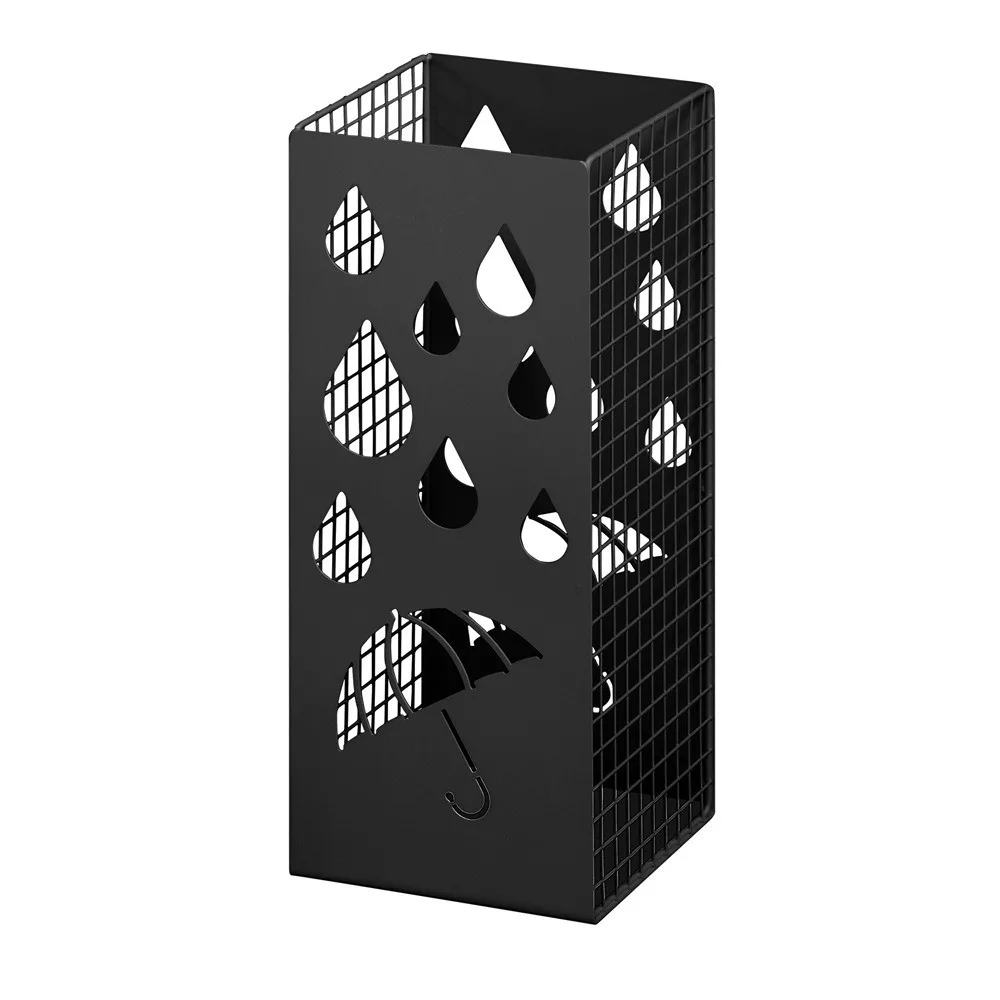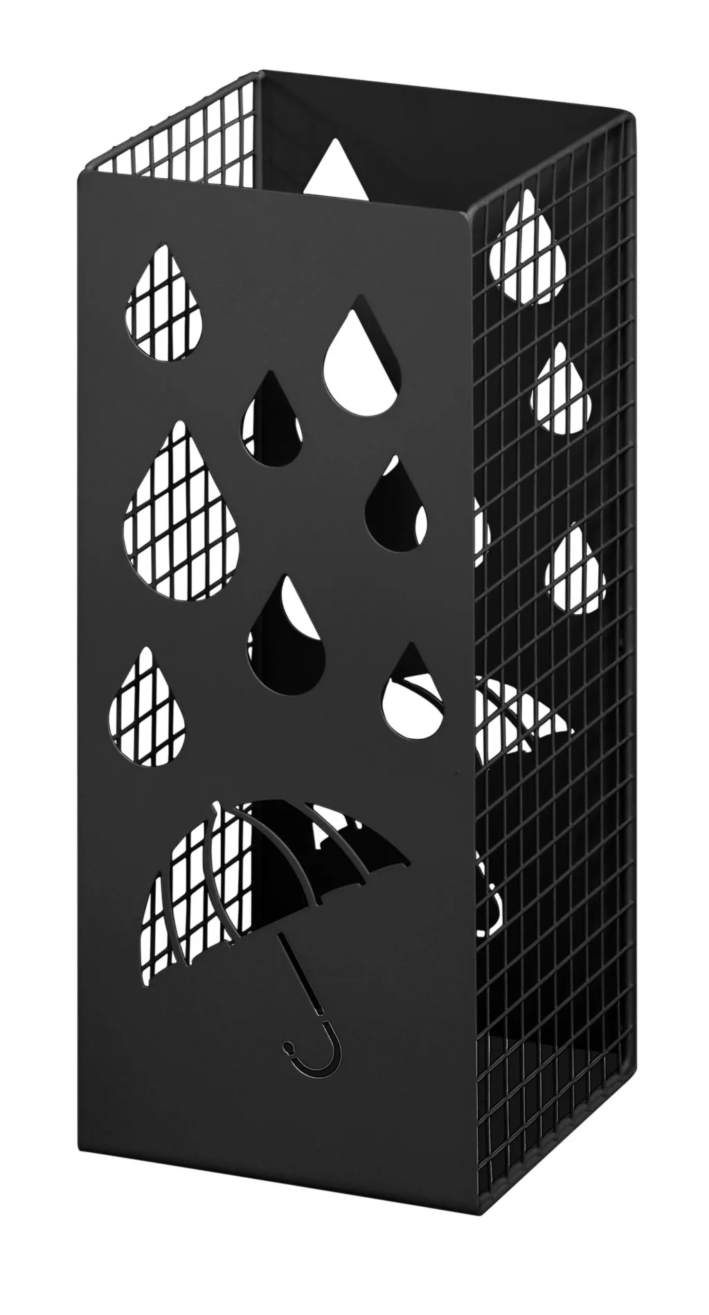 Praktikus esernyőkosár, amely szögletes formájával jól illeszkedik a sarkokba. Teljes egészében acéldrótból és vékony acéllemezekből készült, fekete porszórt bevonattal a jobb védelem érdekében. Ez a szabadon álló kosár használható otthona, lakása vagy irodája bejáratánál vagy előszobájában. Használhatja esernyői, sétabotjai és egyéb kiegészítői tárolására és rendszerezésére. Díszített oldalaival egyszerű dekorációs elemként és egyben masszív esernyőtartóként is remekül mutat.