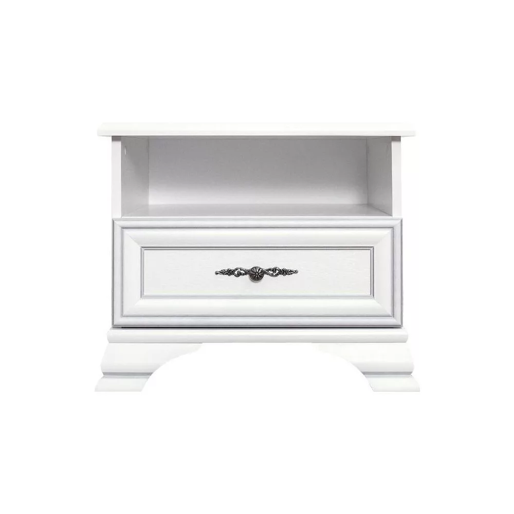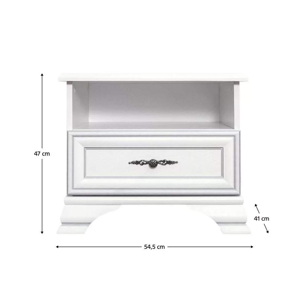Anyag: laminált DTD Szín: alpesi fehér Méretek (SzxMéxMa): 54,5x41x47 cm Anyag vastagsága: 1,6 cm Fém fogantyúk Fogantyúk színe: antik ezüst Fiók Fiók teherbírása: 3 kg Nyitott tárolóhely Lábakon Lábak magassága: 8 cm Szétszerelve szállítva