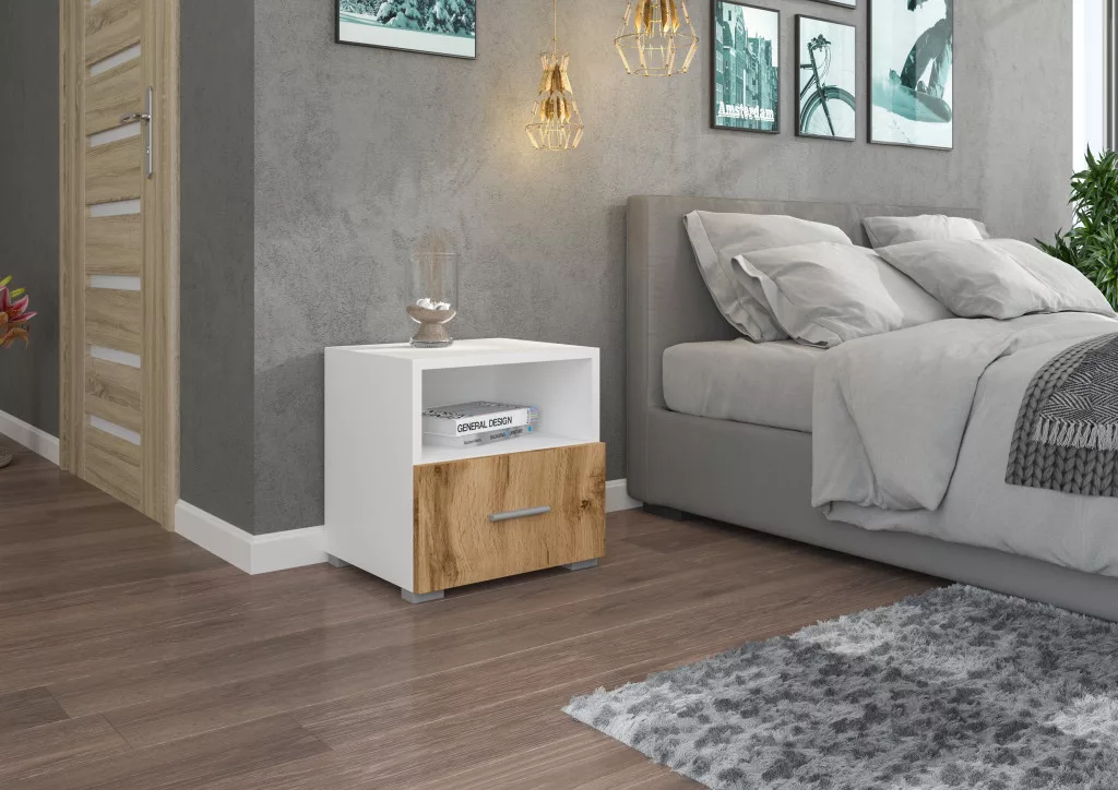 Éjjeliszekrény fiókkal EMI, Fehér, Wotan Tölgy