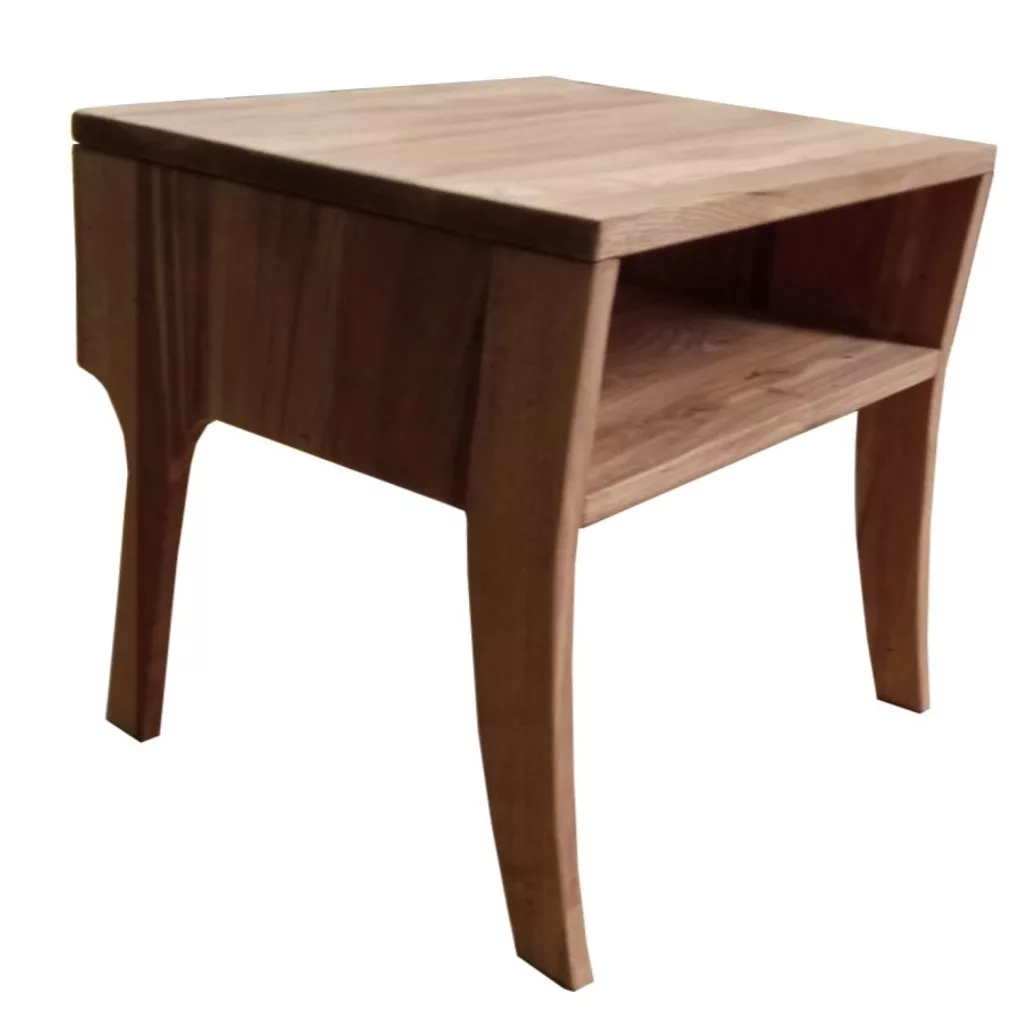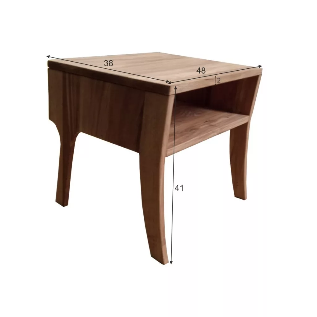 Tömör tölgyfából készült éjjeliszekrény, amely kis éjjeliszekrényként is szolgálhat.Az ívelt lábak, a lekerekített élek és a tölgyfa természetes megjelenése hozzájárul a szekrény kellemes, organikus érzetéhez. Az asztallap szinte négyzet alakú, méretei 48x38 cm, és egy tágas, nyitott polccal rendelkezik a felső lap alatt. Az asztallap 2 cm vastag. Az éjjeliszekrény már összeszerelve érkezik. Tekintse meg az azonos nevű kollekció nagyméretű ágyait is.