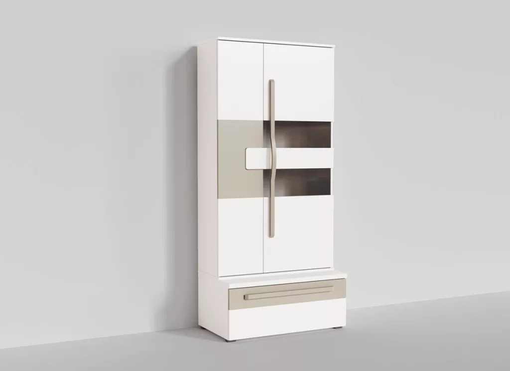 Komód Vitrinnel - A modulEnnek a bútordarabnak a fehér felülete modern megjelenést kölcsönöz. Több tároló- és rendszerezőhelyet kínál polcok vagy tárolórekeszek formájában. A bútor váza 16 mm vastag, melamin bevonatú forgácslapból készült, fóliázott MDF betétekkel, a fogantyúk pedig tömör fából készültek, így elegáns és tartós megjelenést kölcsönöznek neki. A füstölt üveg jelenléte ebben a bútordarabban előnyt jelent, lehetővé téve bizonyos tárgyak bemutatását, amelyeket láthatóvá szeretne tenni. A bútordarabhoz elérhető felület