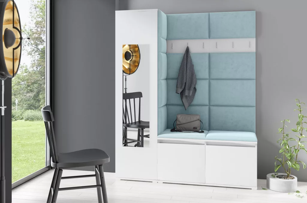 Blum 14 kárpitozott előszobafal tükörrel, fehér - aqua 22 - egyedi