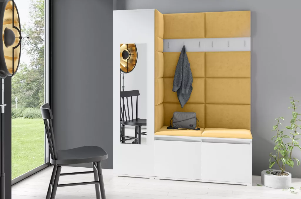 Blum 14 kárpitozott előszobafal tükörrel, fehér - sárga 18 - egyedi