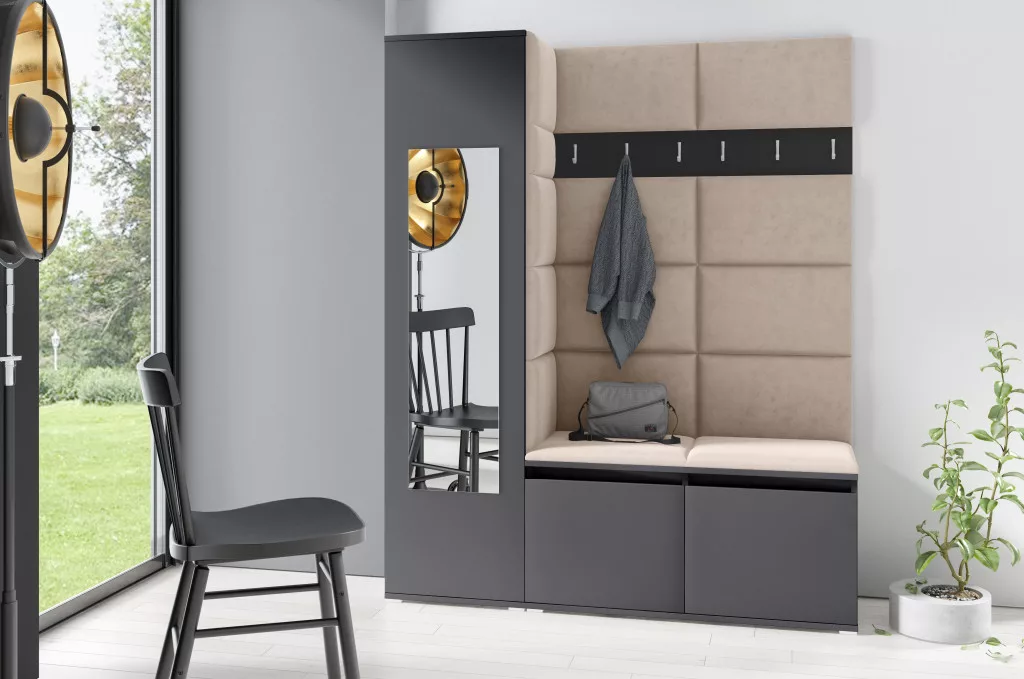 Blum 14 kárpitozott előszobafal tükörrel, grafit - bézs 02