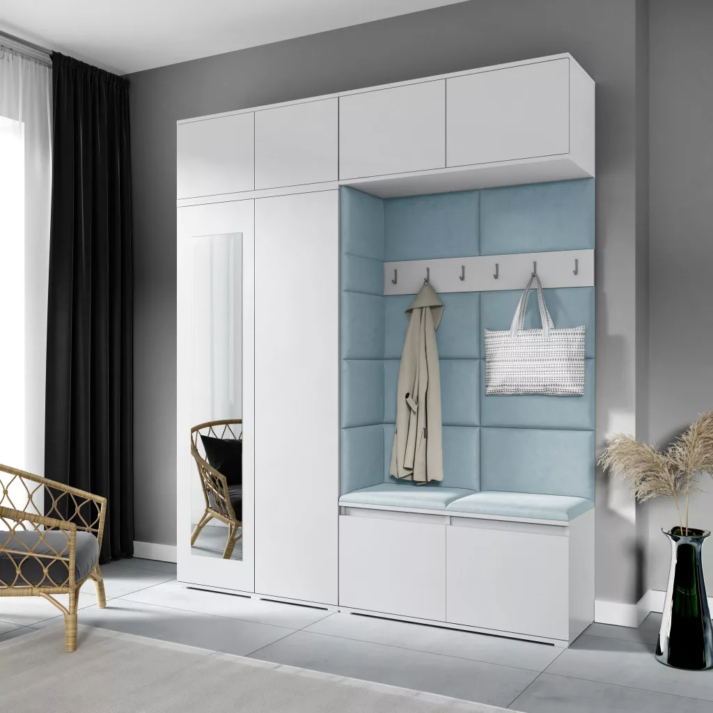 Blum 16 kárpitozott előszobafal tükörrel, fehér - aqua 22 - egyedi