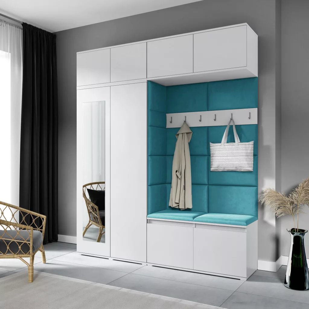 Blum 16 kárpitozott előszobafal tükörrel, fehér - azúr 13 - egyedi