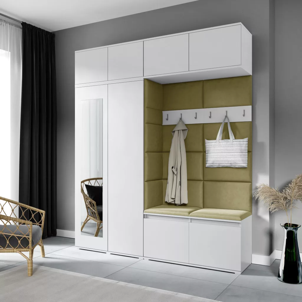Blum 16 kárpitozott előszobafal tükörrel, fehér - oliva zöld 27 - egyedi