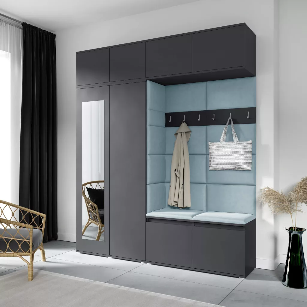 Blum 16 kárpitozott előszobafal tükörrel, grafit - aqua 22 - egyedi