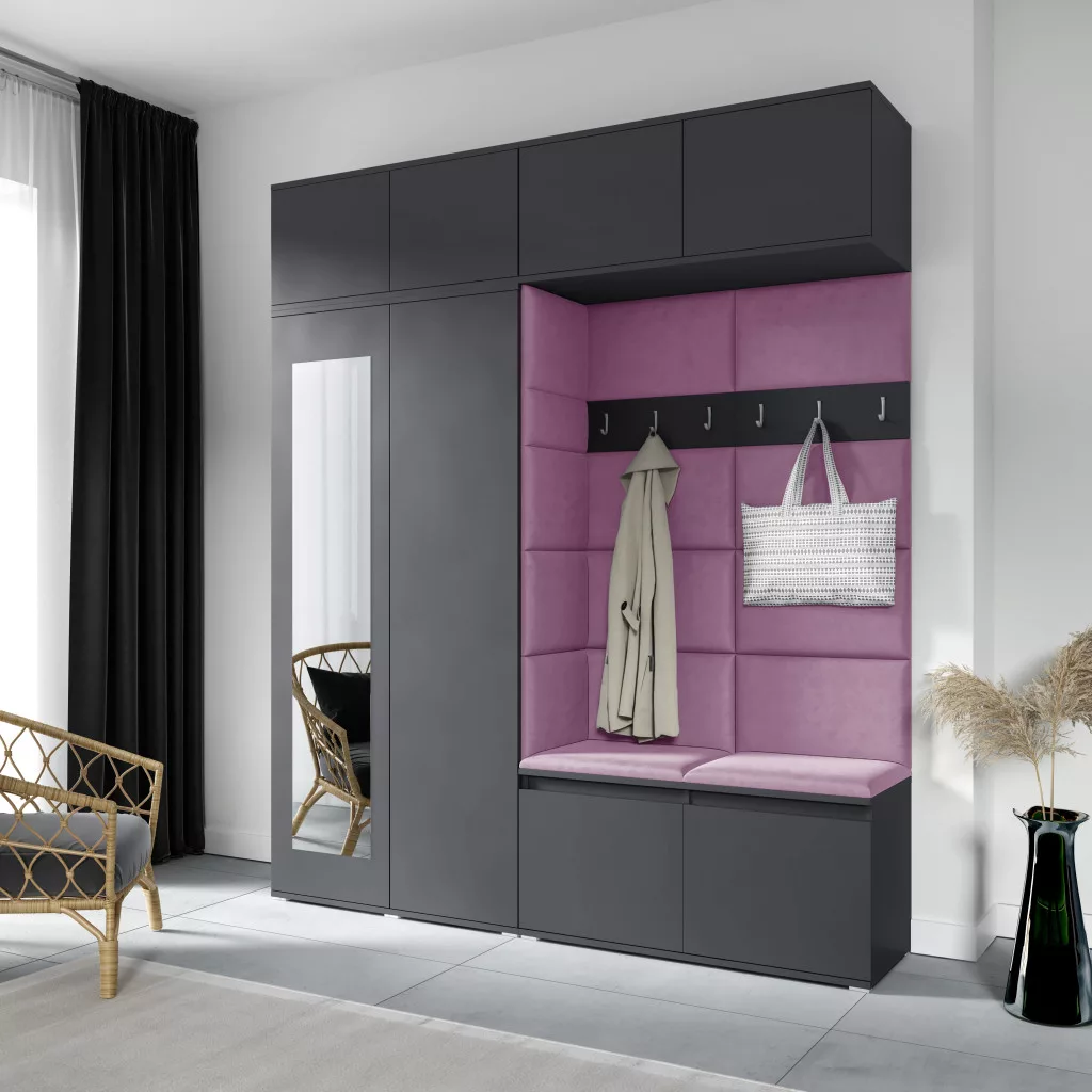 Blum 16 kárpitozott előszobafal tükörrel, grafit - lila 11 - egyedi