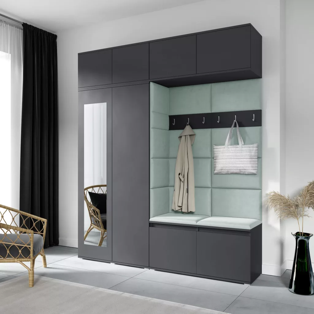Blum 16 kárpitozott előszobafal tükörrel, grafit - menta 21 - egyedi