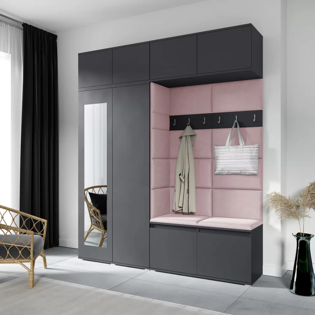 Blum 16 kárpitozott előszobafal tükörrel, grafit - rózsaszín 19 - egyedi