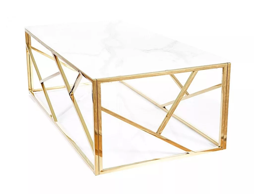 Dohányzóasztal, teteje: edzett üveg, keret: rozsdamentes acél, szín: fehér, márványhatású / arany.