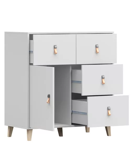 A FIGO komód ötvözi a modern skandináv stílust a funkcionalitással. Tágas,  négy fiókkal és hagyományosan nyitható polc résszel rendelkezik. Az élénk színek a bőr fogantyúkkal varázslatot varázsolnak és egyedi megjelenést kölcsönöznek. A kiegészítő FIGO bútorrendszer pedig lehetővé teszi, hogy bármilyen szettet készítsen, amely a gyermek- vagy ifjúsági szoba igényeihez és méretéhez  igazítható.