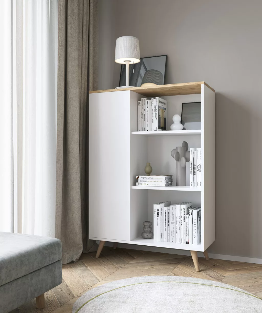A skandináv stílusú FONZI polc egyszerű, ugyanakkor rendkívül funkcionalis bútor. A polcon ajtók és polcok találhatók, így kényelmes helyet biztosít a tároláshoz. A FONZI biztosan illeszkedik a legtöbb berendezésbe, modern és elegáns dizájnt kölcsönözve a térnek.