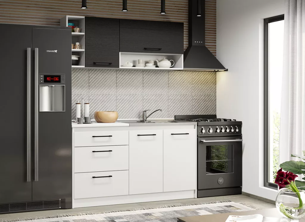 Fehér konyha ferrara Lotus - 02 - 143,2 cm alsó, felső, és magas elemei tágas tárolóhelyet biztosít a beépíthető készülékek, és a konyhai eszközök számára. Az elemek 16 mm-es préselt forgácslapból készülnek. A fehér és a ferrara kombinációja eleganciát és kifinomultságot közvetít.