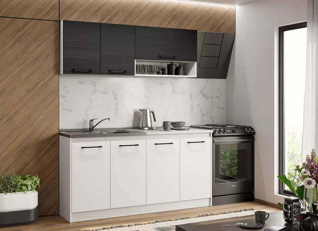 Fehér konyha ferrara Lotus - 03 - 163,2 cm alsó, felső, és magas elemei tágas tárolóhelyet biztosít a beépíthető készülékek, és a konyhai eszközök számára. Az elemek 16 mm-es préselt forgácslapból készülnek. A fehér és a ferrara kombinációja eleganciát és kifinomultságot közvetít.