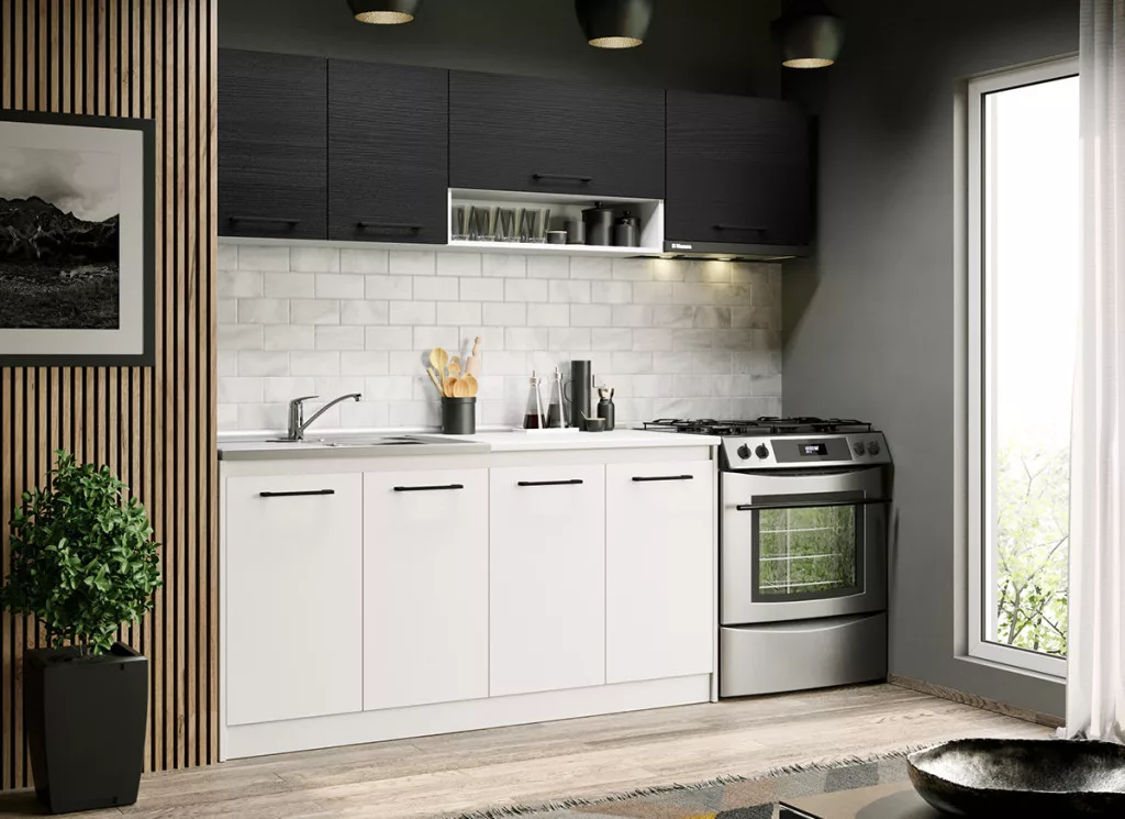 Fehér konyha ferrara Lotus - 07 - 223,2 cm alsó, felső, és magas elemei tágas tárolóhelyet biztosít a beépíthető készülékek, és a konyhai eszközök számára. Az elemek 16 mm-es préselt forgácslapból készülnek. A fehér és a ferrara kombinációja eleganciát és kifinomultságot közvetít.