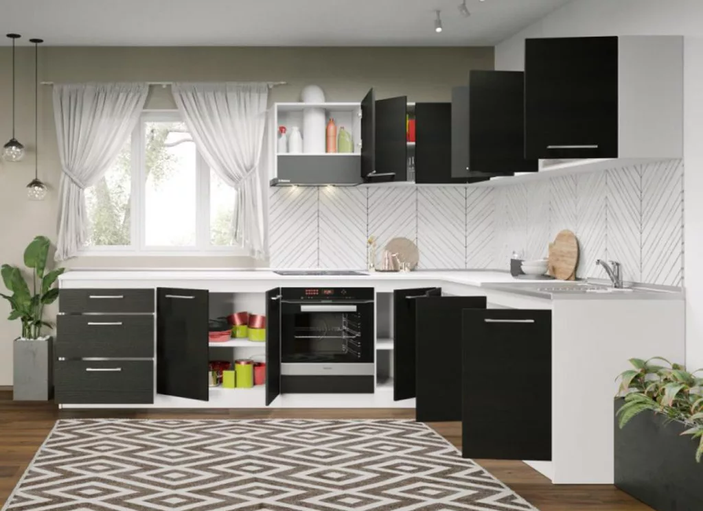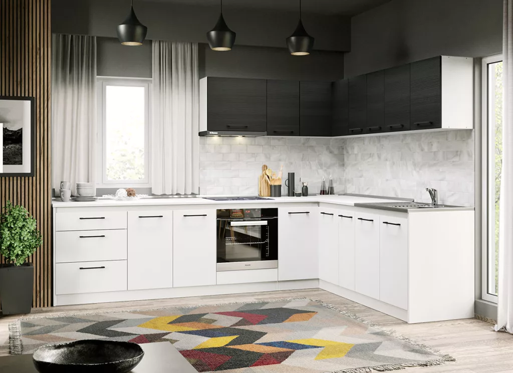 Fehér konyha Ferrara Lotus- 05 - 200 cm alsó, felső, és magas elemei tágas tárolóhelyet biztosít a beépíthető készülékek, és a konyhai eszközök számára. Az elemek 16 mm-es préselt forgácslapból készülnek. A fehér és a ferrara kombinációja eleganciát és kifinomultságot közvetít.