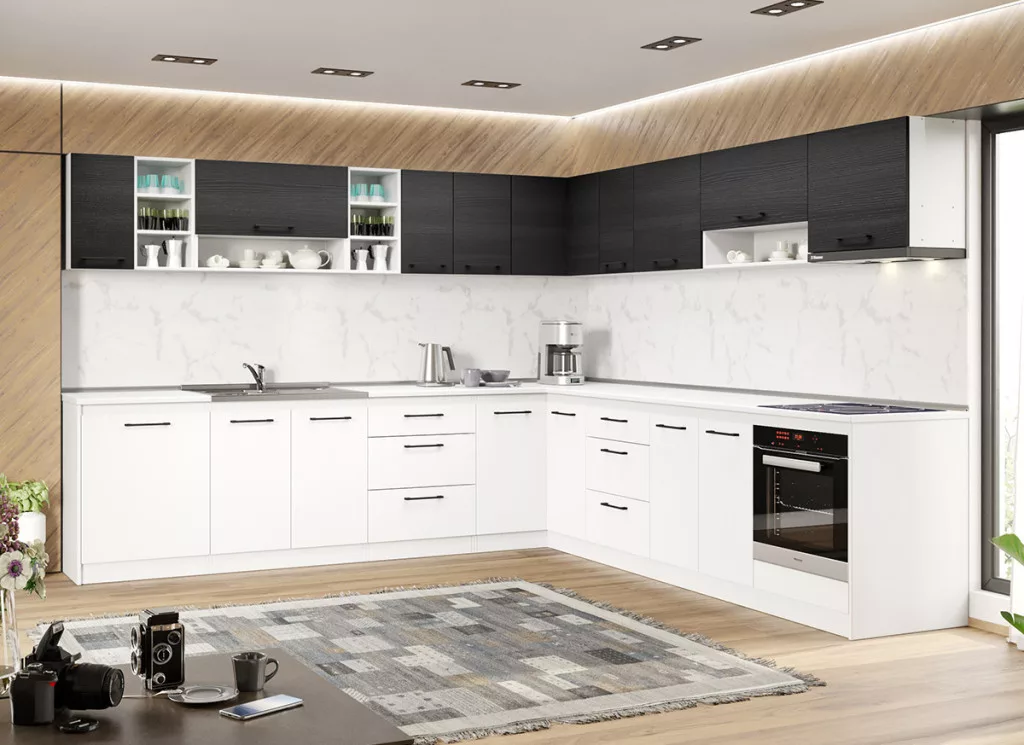 Fehér konyha ferrara Lotus - 33 - 301,6/301,6 cm alsó, felső, és magas elemei tágas tárolóhelyet biztosít a beépíthető készülékek, és a konyhai eszközök számára. Az elemek 16 mm-es préselt forgácslapból készülnek. A fehér és a ferrara kombinációja eleganciát és kifinomultságot közvetít.