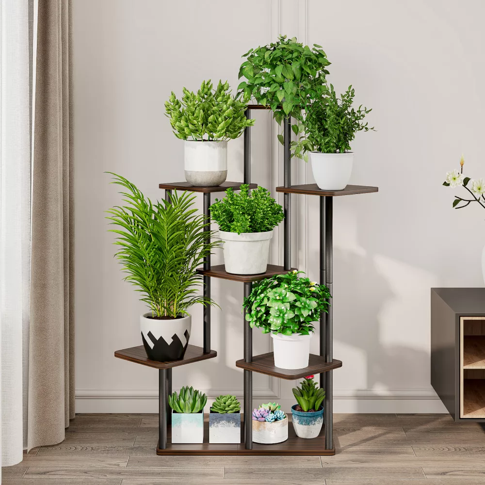Anyag: fém/faforgácslap Szín: fekete/rusztikus fa Méretek (SzxMéxMa): 83,5x58x106,5 cm Állványként cserepes növényekhez 7 polc Teherbírás/polc: 5 kg Rúd vastagsága: 1,9 cm Magasság az 2. és a 4. polc között: 25 cm Magasság az 3. és a 6. polc között: 51 cm Magasság az 1. és a 5. polc között: 77,4 cm Magasság az 5. és a 7. polc között: 25 cm Fém szerkezet Javasoljuk, hogy a polcokat egyenletesen terhelje Praktikus Többfunkciós Modern stílus Szétszerelve szállítva