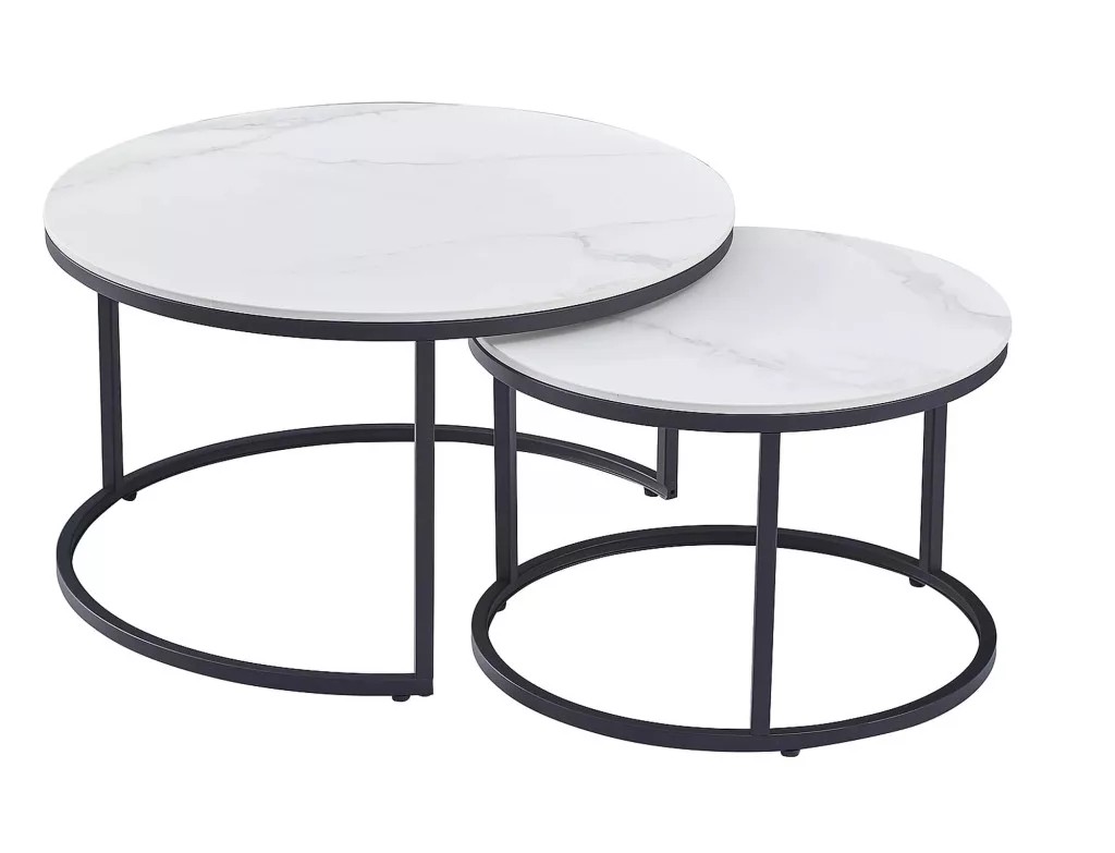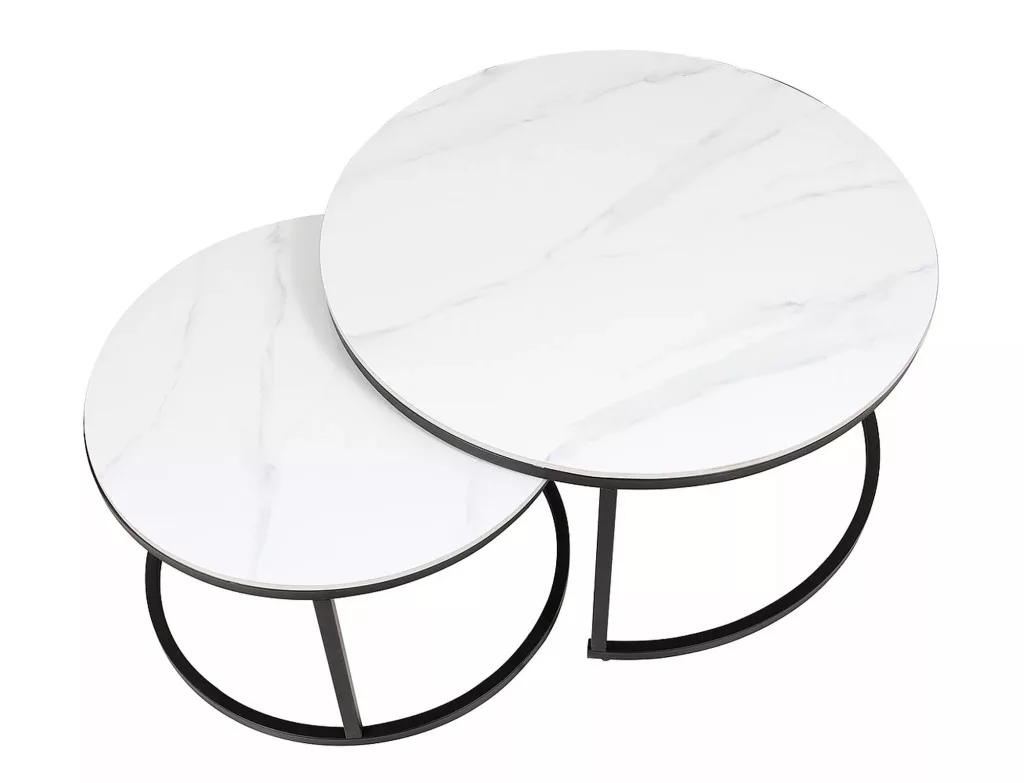 Kávézóasztal szett, asztallap: kerámia, keret: fém, szín: fehér, márványhatású / matt fekete. A kisebb asztal méretei: átmérő: 60; magasság: 38cm.