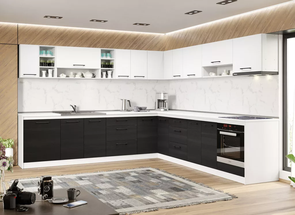 A Luna konyhablokk alsó, felső, és magas elemei tágas tárolóhelyet biztosít a beépíthető készülékek, és a konyhai eszközök számára. Az elemek 16 mm-es préselt forgácslapból készülnek. A fehér és a ferrara kombinációja eleganciát és kifinomultságot közvetít.