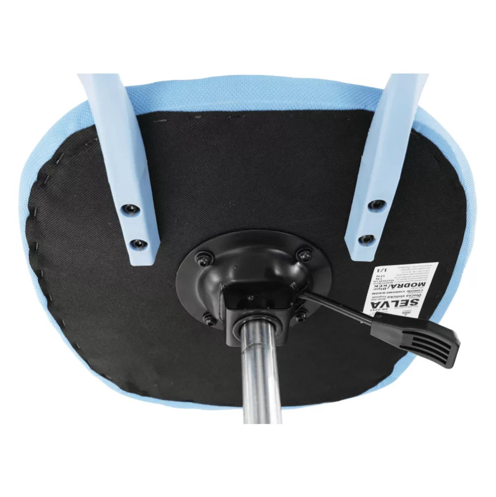 Szék SELVA Anyag:poliészter/fém A szövet kopásállósága: 100 000 Martindale Színe: kék/króm Méretek (SzéxMéxMa): 53x53x74,5-86,5 cm Állítható ülésmagasság : 42-54 cm Ülésmélység : 38 cm Ülésszélesség : 40 cm Háttámla magassága: 32 cm Háttámla szélessége: 36 cm Terhelhetőség: 80 kg Forgó Förgőkkel Lyukacsos háttámla Szétszerelve szállítjuk