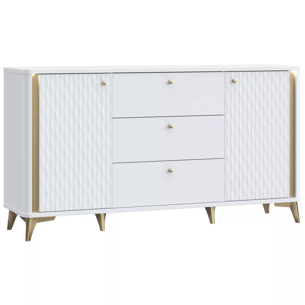 Egy óriási tálalószekrény nappalikba, hálószobákba vagy előszobákba, gyönyörű fehér és arany díszítőelemek kombinációjában. A fiókos szekrény lekerekített sarkokkal rendelkezik a kellemes, lágyabb megjelenés érdekében, és három részre van osztva. A felső lapja akár 20 kg súlyt is elbír.
