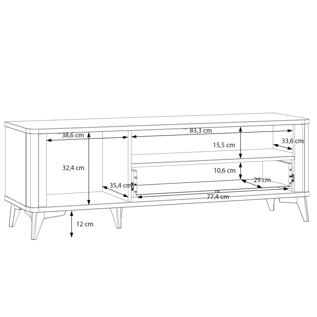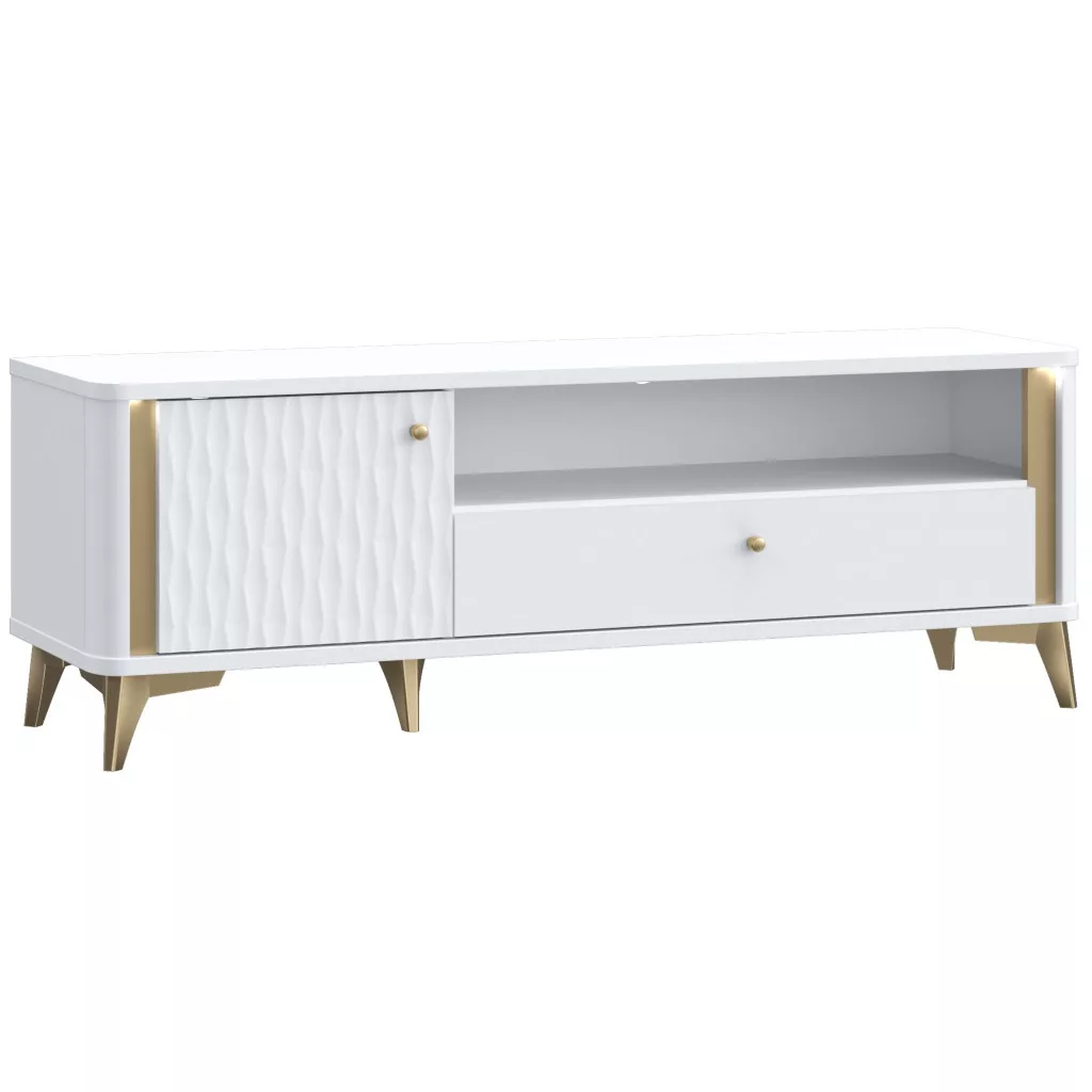 Modern TV-állvány, gyönyörű fehér és arany díszítőelemek kombinációjában, lekerekített sarkokkal a kellemes, lágyabb megjelenés érdekében. Jobb oldalon egy profilozott ajtós szekrény található, jobb oldalon egy széles, fém síneken futó fiók és felette egy nyitott rész, ahol kisebb tárgyakat tárolhat. A fiók 10,6 cm magas és 77,4 cm széles, a felette lévő nyitott rész 83,3 cm széles, 15,5 cm magas és 33,6 cm mély, a bal oldali szekrény hasznos belső tere pedig 38,6 cm széles, 32,4 cm magas és 35,4 cm mély. Mindkét oldalon kábelvezető lyukak találhatók a hátoldalon. A szekrény és a fiók fogantyúi arany színű fémből készültek. A teljes TV-állvány 12 cm magas, arany színű fémlábakon áll.