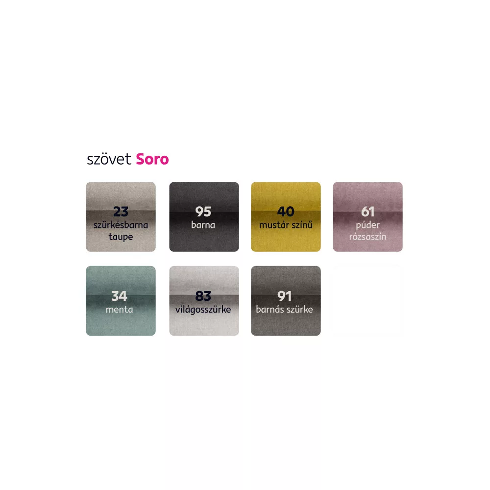 Anyag: szövet Soro 97/90 A szövet kopásállósága a Martindale teszt szerint: 90 000 - 100 000 ciklus Szín: sötétszürke/világosszürke Méretek (SzxMéxMa): 56x52x85 cm Ülés magassága: 44 cm Ülés mélysége: 51 cm Töltet: poliuretán hab Teherbírás/személy: 90 kg Teljesen kárpitozott Műanyag lábak Az alsó tér magassága a padlótól: 2 cm Praktikus Modern Klasszikus stílus Egészben szállítva Megrendelhető a Soro szövet 7 színváltozatában ár 61 500 Ft. Egyedi megrendelés esetén az adott összeg 20%-át előlegként szükséges befizetni. Az előleg befizetése után a megrendelése gyártásba kerül. A szállítási idő 6-8 hét.