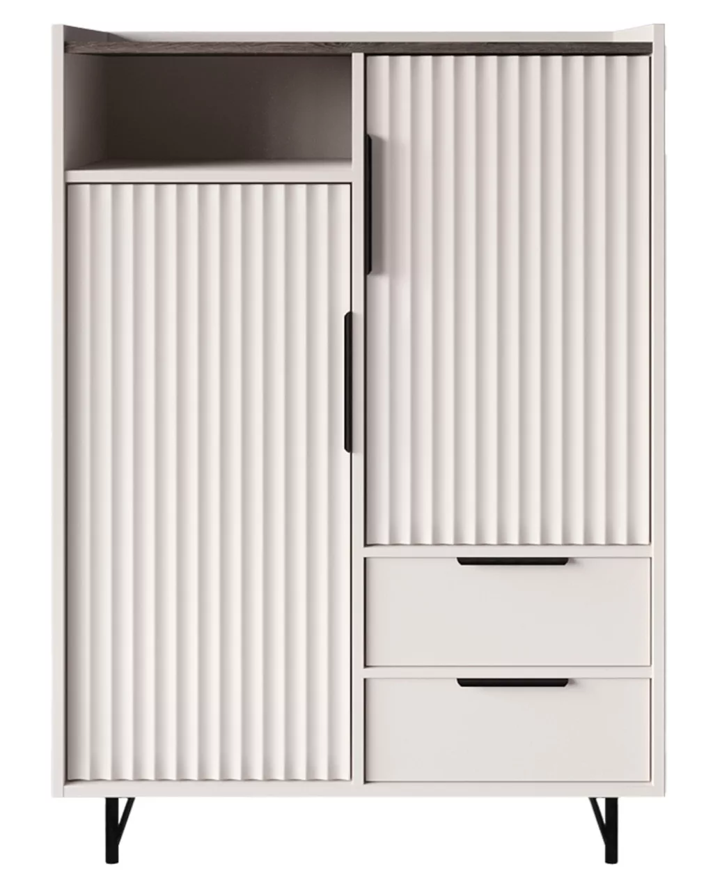 Modern, letisztult vonaltervezésű nappalisorunk elegáns és praktikus megoldást kínál bármely otthonba. A függőleges bordázott ajtók finom textúrát adnak a bútornak, miközben megőrzik a minimalisták által kedvelt egyszerűséget. A széles Tv szekrény tágas tárolóhelyet bizotsít. A karcsú, fekete lábak stabil tartást adnak, ugyanakkor modern megjelenést kölcsönöznek.
