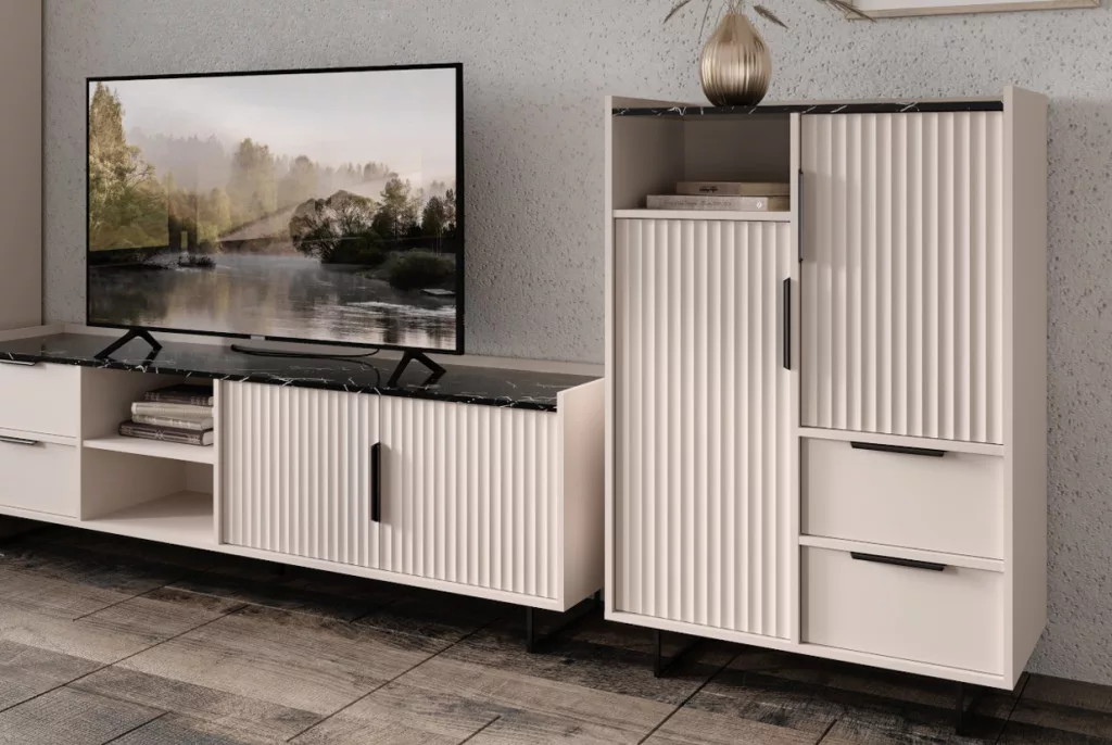 Modern, letisztult vonaltervezésű nappalisorunk elegáns és praktikus megoldást kínál bármely otthonba. A függőleges bordázott ajtók finom textúrát adnak a bútornak, miközben megőrzik a minimalisták által kedvelt egyszerűséget. A széles Tv szekrény tágas tárolóhelyet bizotsít. A karcsú, fekete lábak stabil tartást adnak, ugyanakkor modern megjelenést kölcsönöznek.