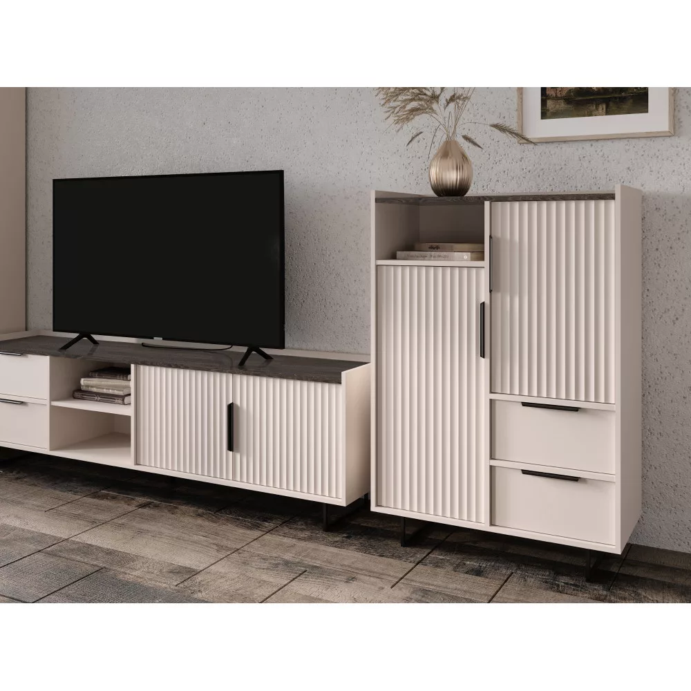 Modern, letisztult vonaltervezésű nappalisorunk elegáns és praktikus megoldást kínál bármely otthonba. A függőleges bordázott ajtók finom textúrát adnak a bútornak, miközben megőrzik a minimalisták által kedvelt egyszerűséget. A széles Tv szekrény tágas tárolóhelyet bizotsít. A karcsú, fekete lábak stabil tartást adnak, ugyanakkor modern megjelenést kölcsönöznek.