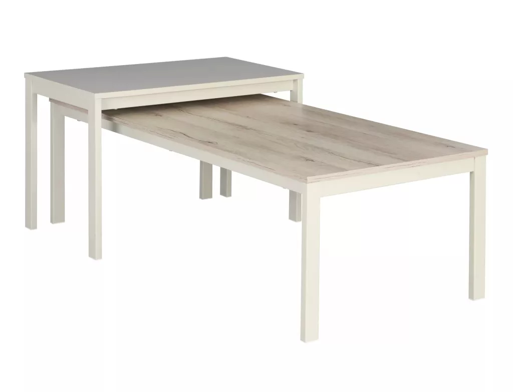 Dohányzóasztal, teteje: laminált bútorlap, váz: fém, szín: törtfehér + alpesi tölgy / törtfehér.
