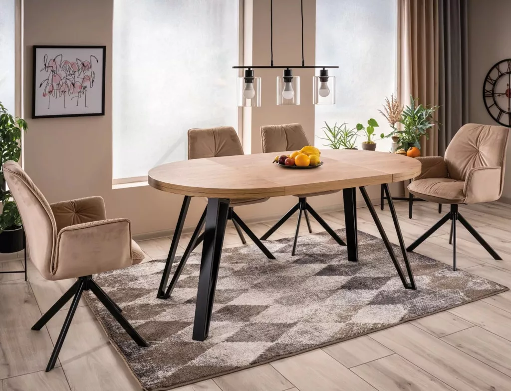Meghosszabbítható asztal, teteje: laminált forgácslap, váz: fém, szín: kézműves tölgy / fekete. Kerek asztal, 68 cm széles kiegészítő asztallappal (a betét külön tárolható). Asztallap vastagsága 48 mm.