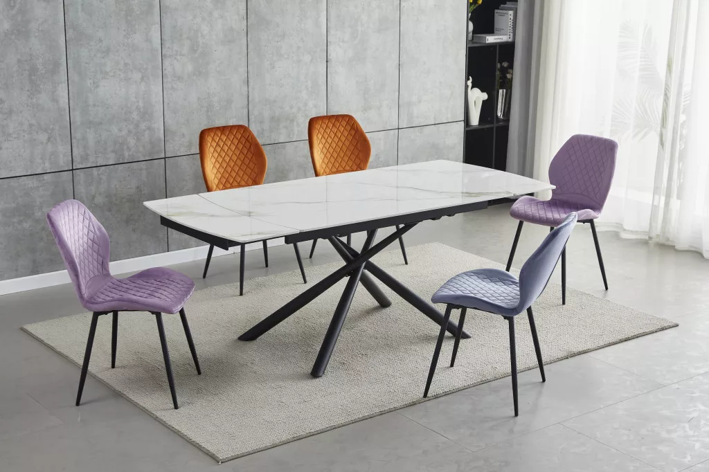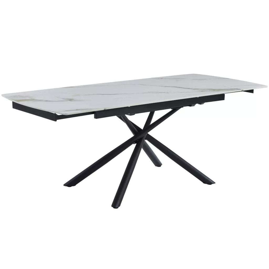 Modern, kihúzható asztal téglalap alakú, magasfényű felülettel, gyönyörű arany márvány színben kapható. Az asztallap 11 mm vastag, és kiváló minőségű fehér márványkerámiából készült, arany erezetekkel. A lap szélei szépen lekerekítettek. Az asztal két 30 cm széles betéttel 140-200 cm-re bővíthető. Az asztal váza és lábai fémcsövekből készültek, és homokfekete porfestékkel vannak bevonva. A fémcső lábak átlója 60 mm. Az asztal maximális teherbírása 50 kg.