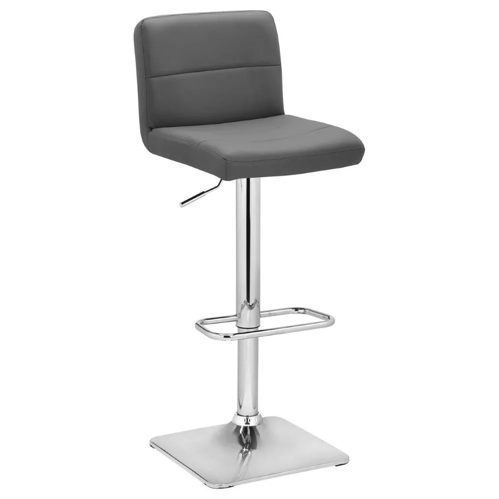 Modern bárszék, minőségi szürke műbőrrel kárpitozva, alacsony háttámlával. A szék forgatható és állítható magasságú, gázmechanizmussal a tartóoszlopban. Az ülőfelület magassága így 64 cm és 84 cm között állítható. A fém lábtartó fényes króm felületű. A lábtartón egy négyzet alakú lábtartó is található, ami kényelmesebbé teszi az ülést. A krómozott, négyzet alakú padlólap jó stabilitást biztosít. A bárszék maximális teherbírása 120 kg.