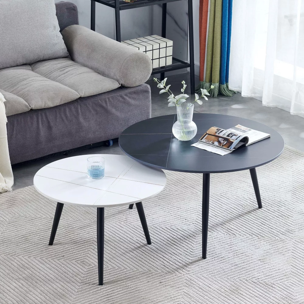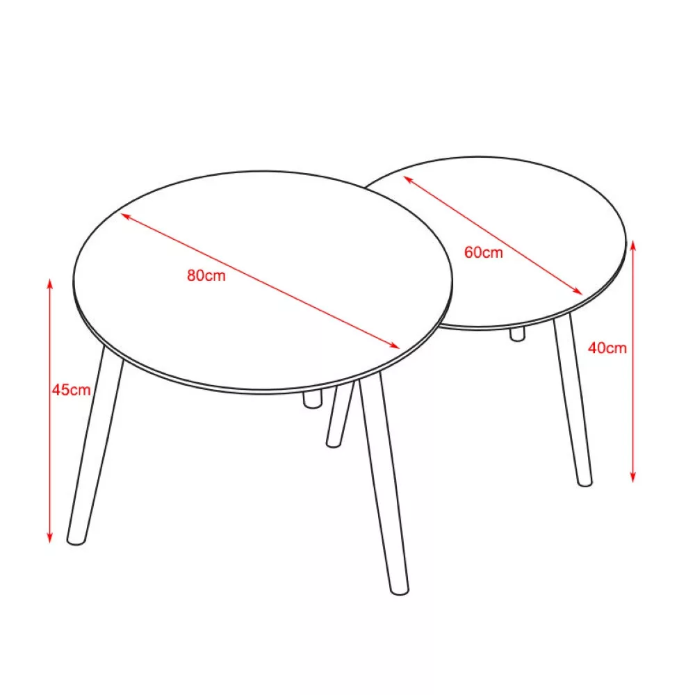 Két kerek dohányzóasztalból álló szett, a kisebb matt Lauren fehérarany, a nagyobb matt Lauren feketearany színben, márvány mintával. Az asztalok szinterezett kőből készültek és 1,2 cm vastagok. A szinterezett kő különböző színű természetes kövek kombinációjából készül, és számos előnnyel rendelkezik a hagyományos kerámiákkal szemben. Erősebb, mint a nagy kerámialapok, és nem törik könnyen. A természetes gránitból készült lapokhoz képest természetesen vízálló is. Környezetbarátabb is, mint a kémiailag kezelt kvarclapok. A nagyobb asztal átmérője 80 cm, magassága 45 cm, míg a kisebb asztal átmérője 60 cm, magassága 40 cm. Mindkét asztal alapja fekete porszórt fémcsövekből készült. Mindkét asztal maximális teherbírása 120 kg.