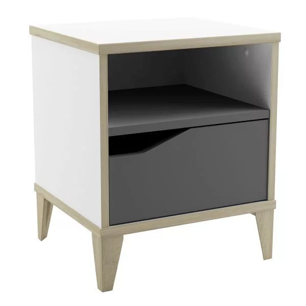 Az éjjeliszekrény skandináv stílusban készül, fa színű és kúpos alakú emelt lábakkal. Ugyanaz a fa dekoráció folytatódik a szekrény minden látható szélén. Az éjjeliszekrény egy szürke fiókajtóval tűnik ki, amelynek bal felső sarkában lekerekített kivágás van, amely helyettesíti a fogantyút. A fiók felett egy nyitott polc található. A felső fedőlap vastagsága 18 mm