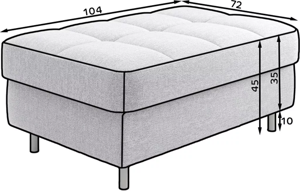A 45 cm (magasság) x 72 cm (szélesség) x 104 cm (hosszúság) méretű Gomsi puff elegáns és funkcionális bútordarab. A puff masszív fekete fém lábakkal rendelkezik, amelyek stabilitást és modern megjelenést kölcsönöznek. A beépített ágyneműtartó rekesz további tárgyak praktikus tárolását teszi lehetővé, így ideális megoldás kis helyekre, ahol minden centiméter számít. A használat kényelméről olyan kiváló minőségű anyagok gondoskodnak, mint a HR hab és a T2130 hab, melyek garantálják a kényelmet és a tartósságot. A puff megjelenése esztétikus és modern, így tökéletesen illeszkedik a különböző belsőépítészeti stílusokhoz.