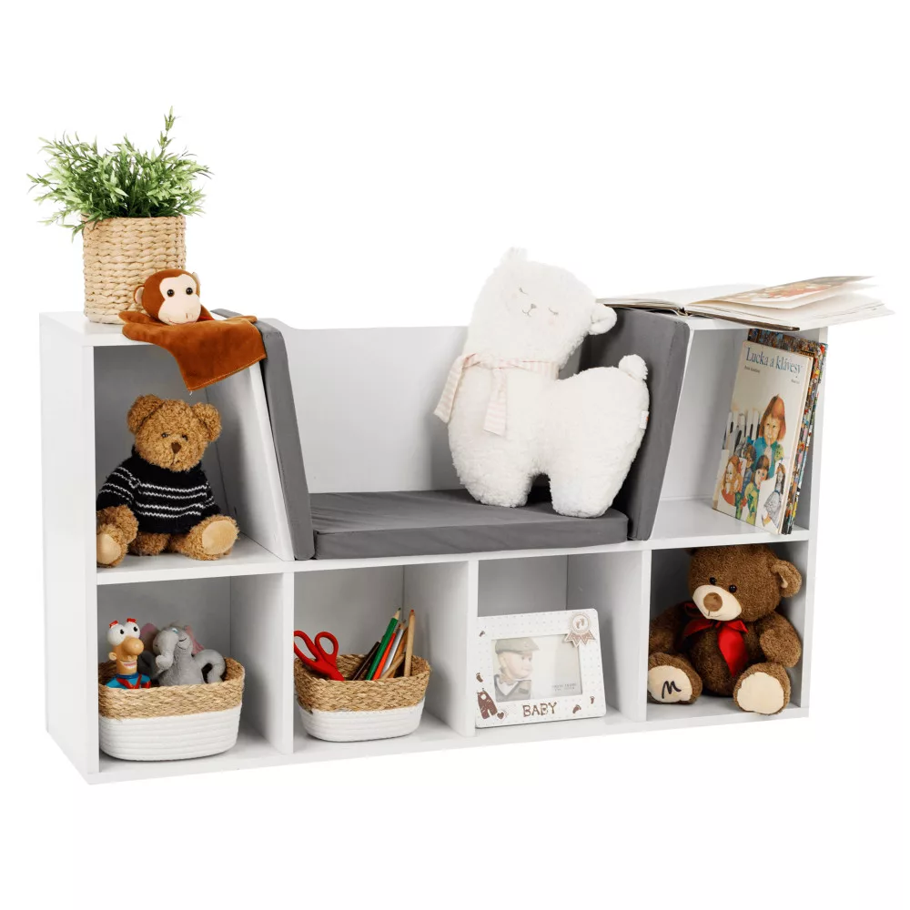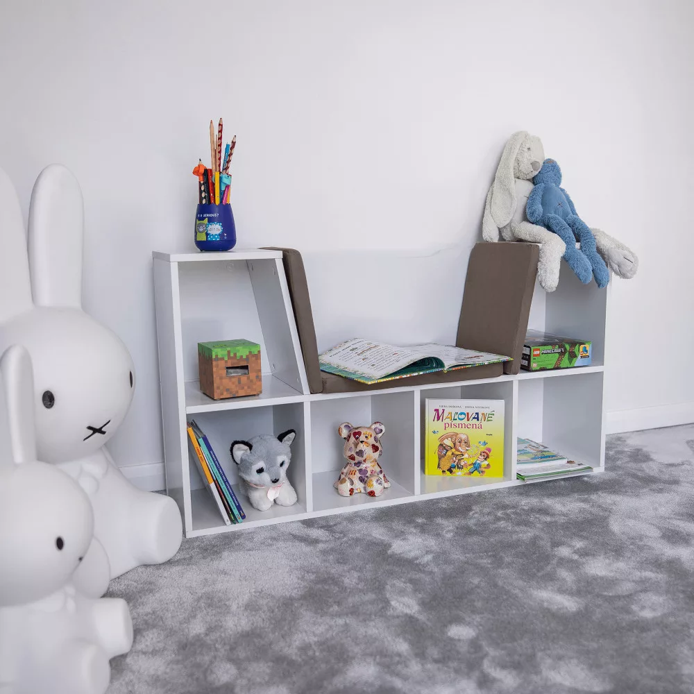 Gyerekkönyvtár ülőhellyel, fehér/barna, FERIA