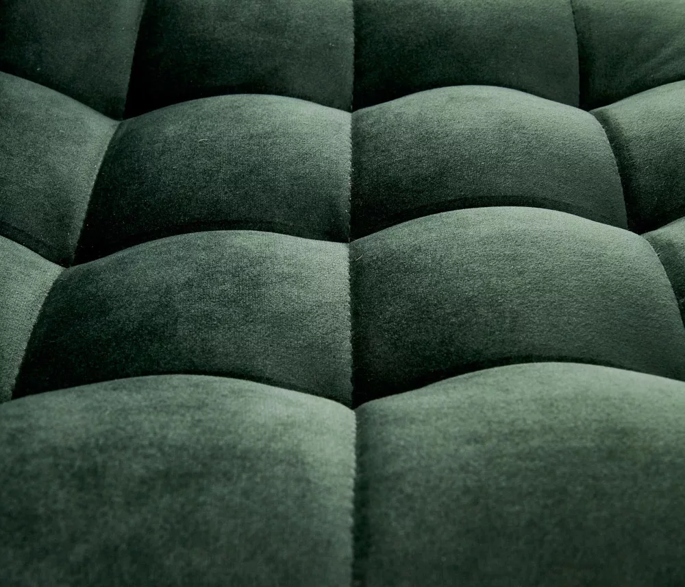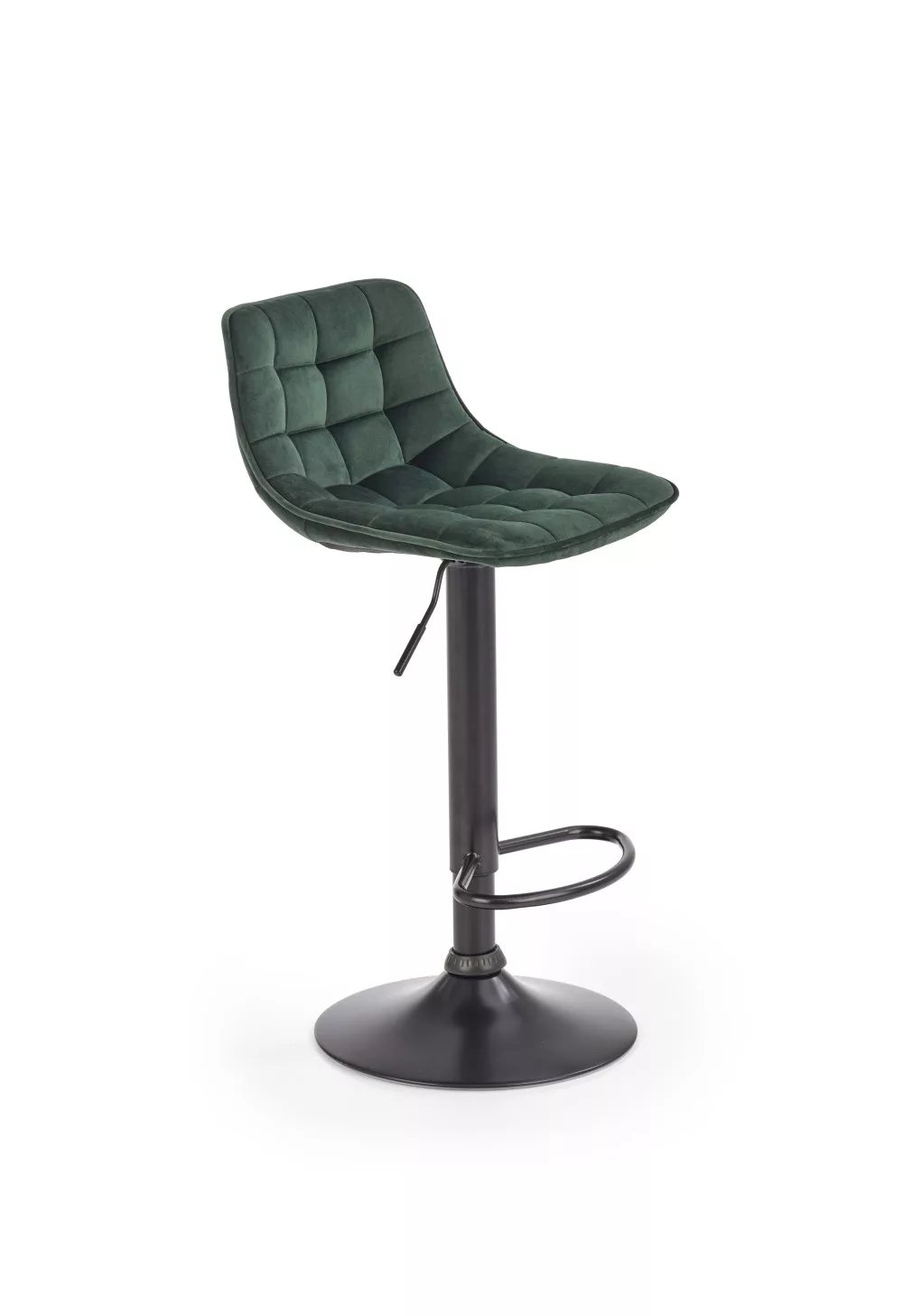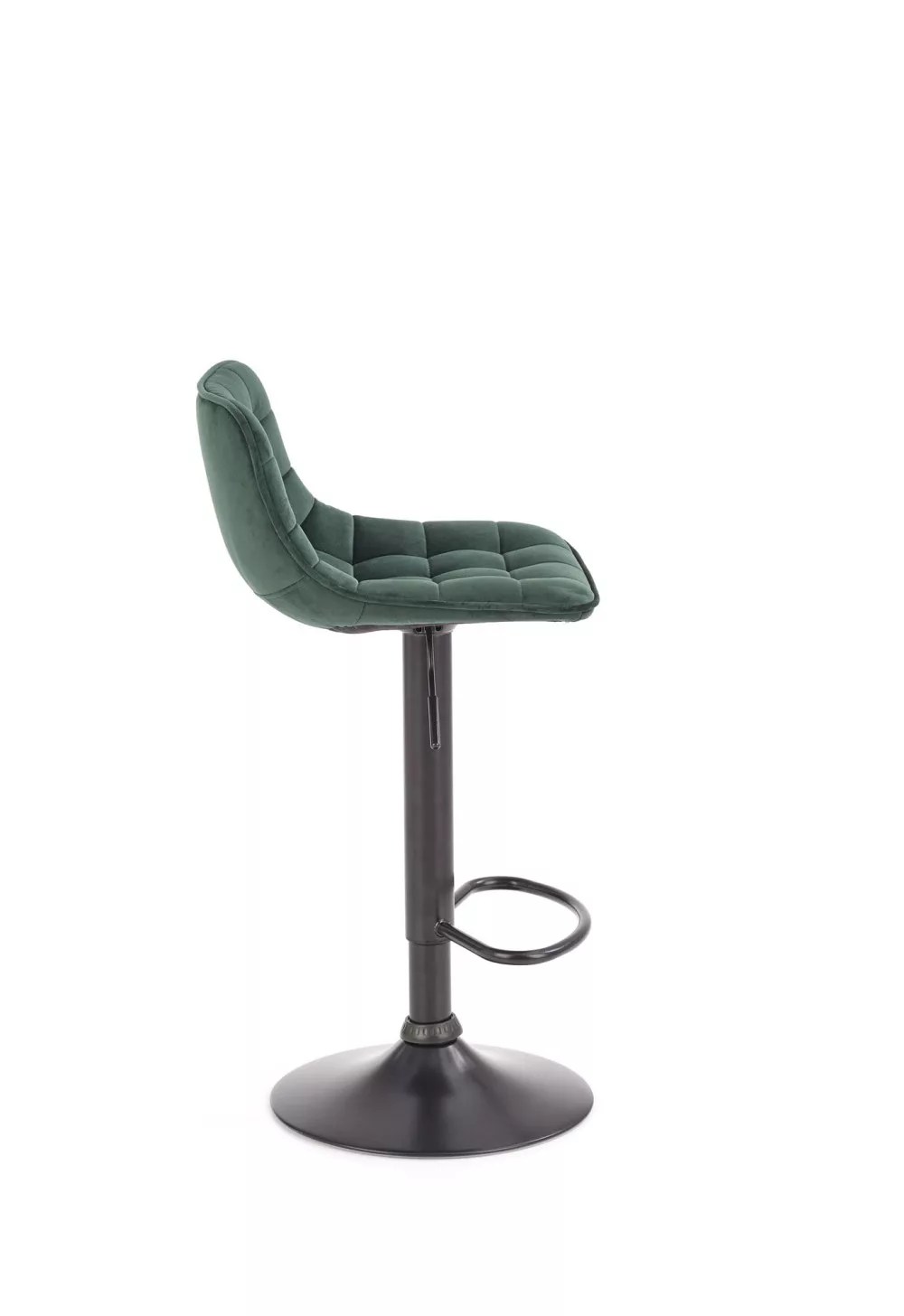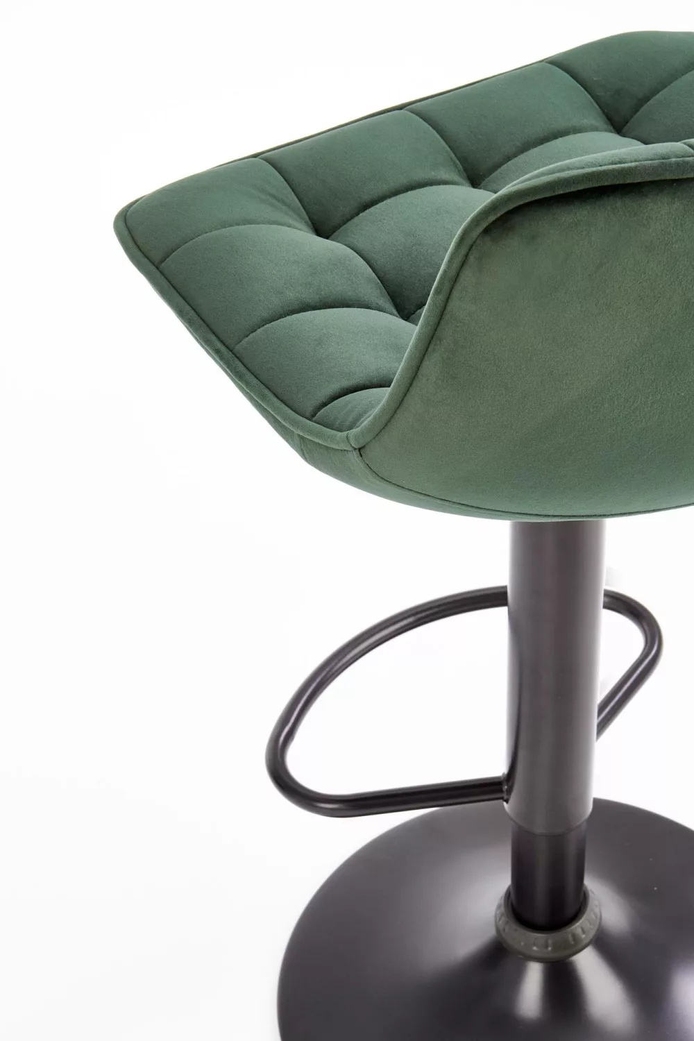 Modern kialakítású, elegáns megjelenésű bárszék. A szék ülőfelülete és háttámlája sötétzöld színű bársonyos szövettel borított, lába porszórt acélból készült.