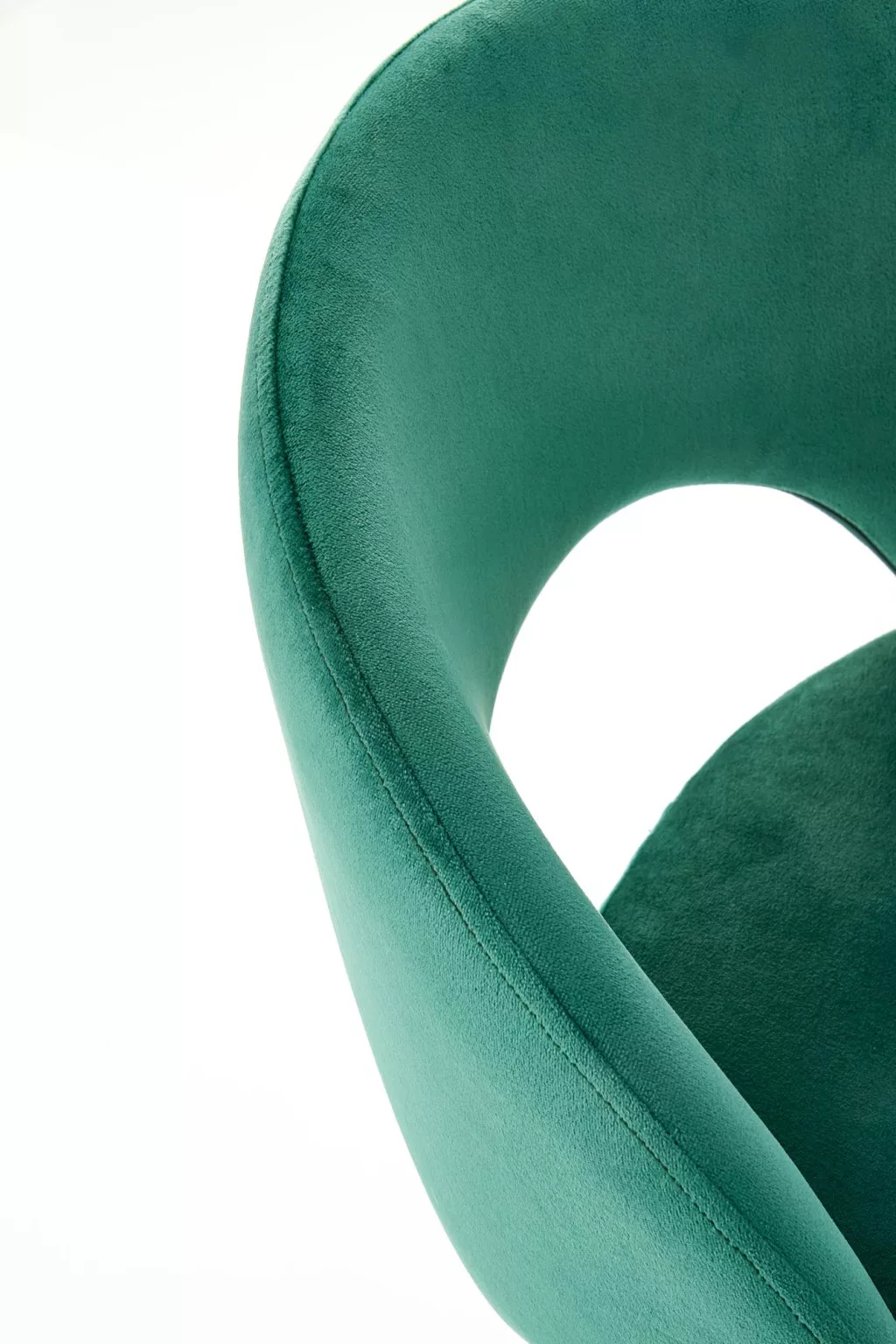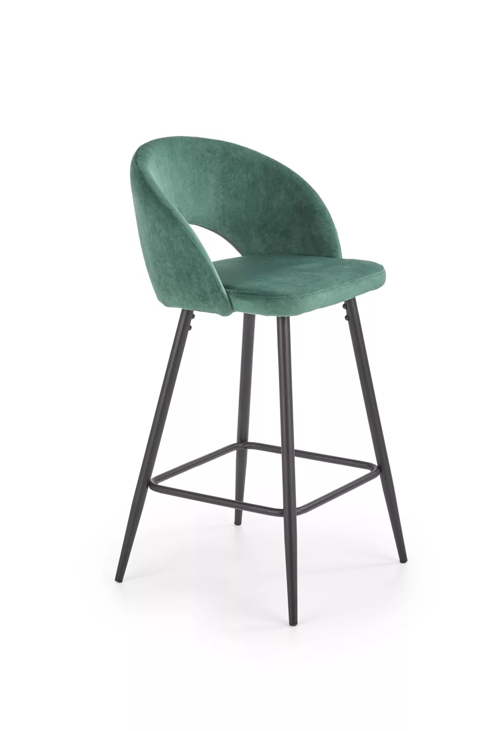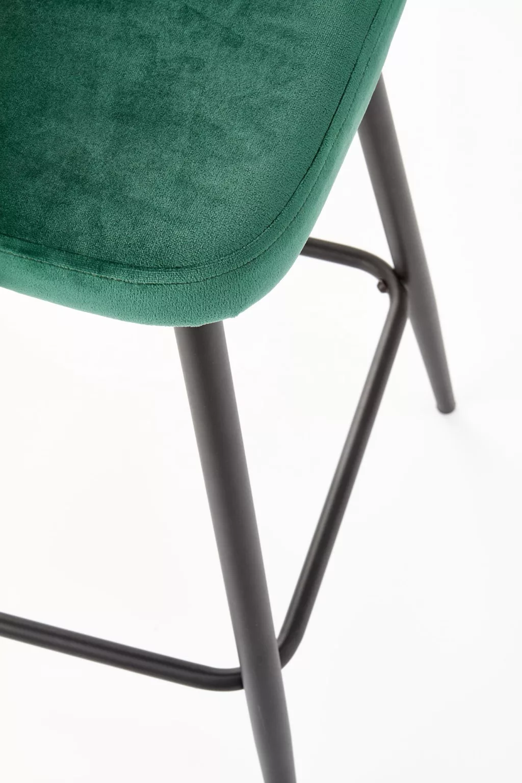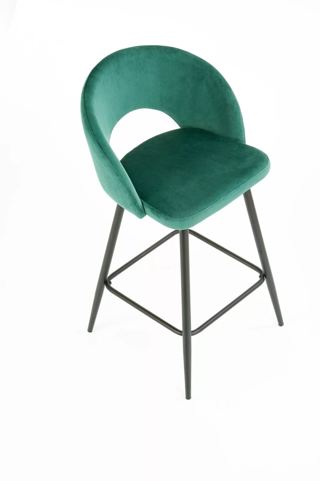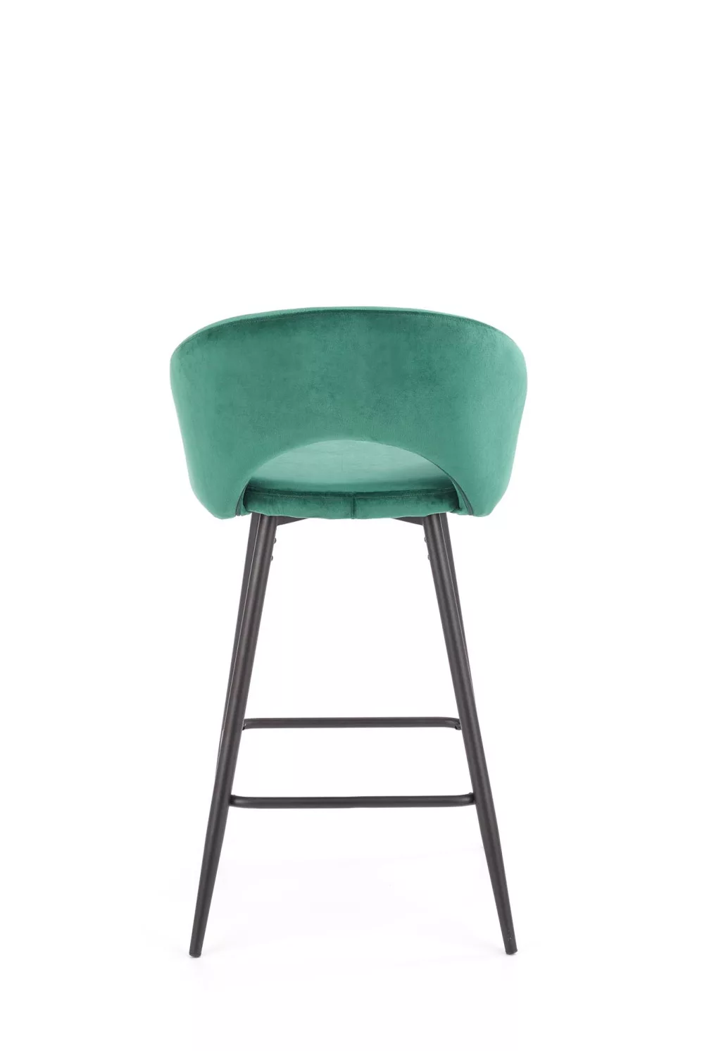 Modern kialakítású, elegáns megjelenésű bárszék. A szék ülőfelülete és háttámlája zöld színű bársonyos szövettel borított, lába porszórt acélból készült.