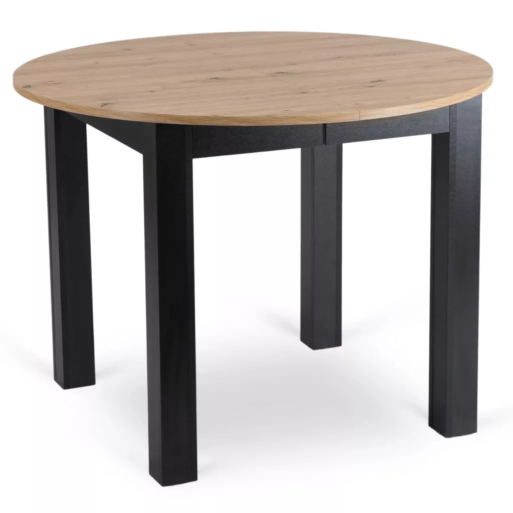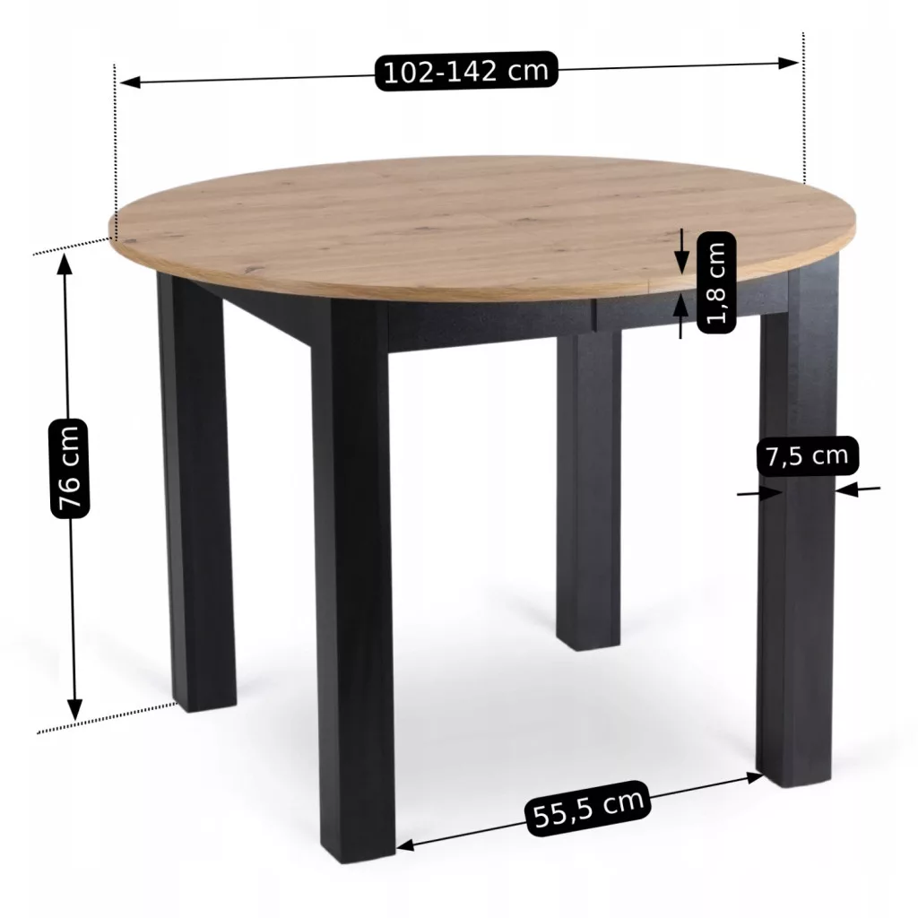 HARRY Kerek asztal 102-142 cm Artisan Tölgy/Fekete. A funkcionalitás néha sokat elárul. A HARRY asztalnak nincs szüksége dekoratív részletekre - a varázsa az átgondolt kialakításában és a praktikus használatában rejlik. A meleg, kézműves tölgy árnyalatú kerek asztallap és a stabil fekete talp olyan szettet alkot, amely tökéletesen illeszkedik egy modern nappaliba, étkezőbe vagy karakteres konyhába. Mindennapokra és különleges alkalmakra is. A 102 cm átmérőjű asztallap tökéletes a mindennapi étkezésekhez, és a kihúzható funkciónak köszönhetően gyorsan további helyet nyerhet - akár 142 cm hosszúra. A sima felület könnyen tisztítható, az ABS szegély pedig növeli a sérülésekkel szembeni ellenállást. A stabil talp és a loft kialakítása