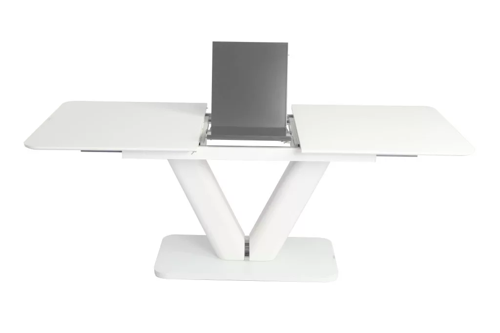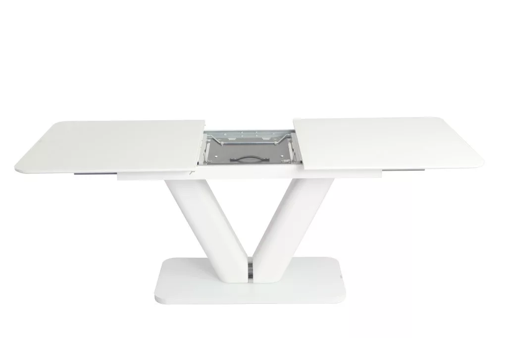 Az asztal lapja matt festett MDF melyet edzett üveg fedtek, bővítése speciális billenő mechanikával és erős bovdenes vasalattal történik.