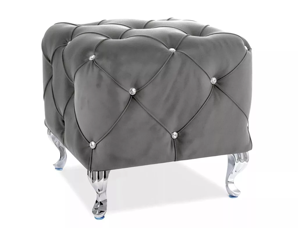 Puff, bársony anyag: szürke BLUVEL 14 / lábak: fém, szín: ezüst. Kristályok (gombok) száma: 29 db, lábmagasság: 14 cm.