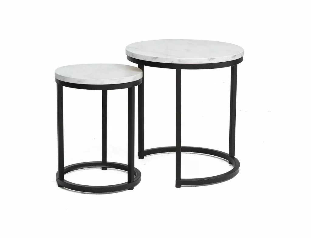 Kávézóasztal szett, asztallap: laminált forgácslap, váz: fém, szín: fehér, márványhatású / matt fekete. A kisebb asztal méretei: átmérő 32; magasság: 42 cm.