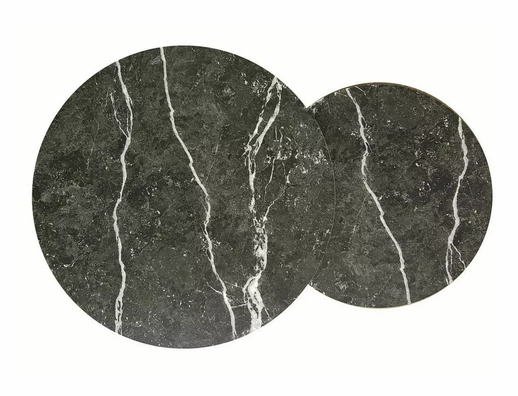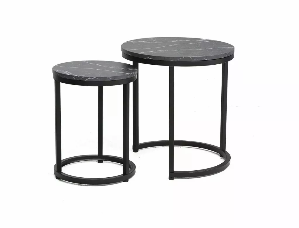 Kávézóasztal szett, asztallap: laminált forgácslap, váz: fém, szín: fekete, márványhatású / matt fekete. A kisebb asztal méretei: átmérő 32; magasság: 42 cm.