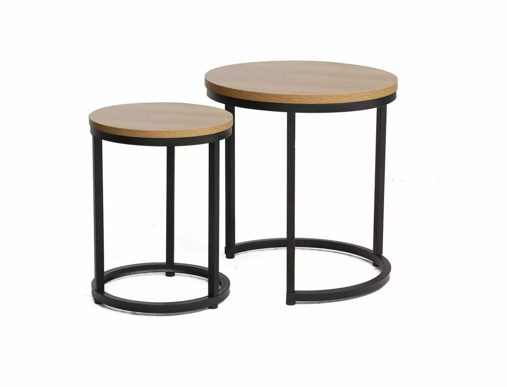 Kávézóasztal szett, asztallap: laminált forgácslap, váz: fém, szín: tölgy / matt fekete. A kisebb asztal méretei: átmérő: 35; magasság: 42 cm.