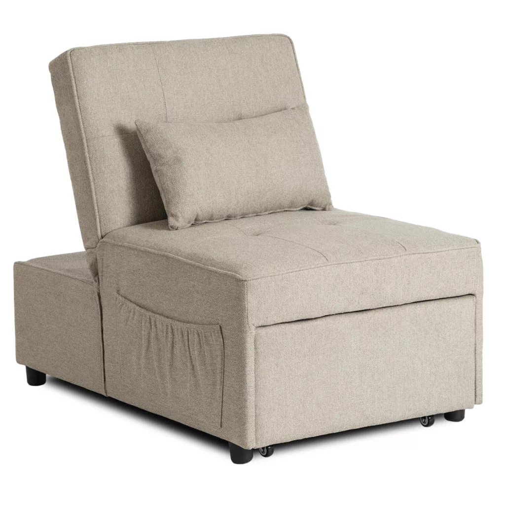 IBERIS 67 cm-es dönthető nyugágy - Bézs Vannak napok, amikor csak egyetlen dologról álmodozol: belesüppedni egy puha fotelbe, mély levegőt venni, és egy pillanatra mindent elfelejteni. Mi lenne, ha ugyanez a bútordarab esténként kényelmes nyugágyává, vagy egy vendég vészhelyzeti ággyá alakulhatna? Az Iberis fotel meglepően kompakt kialakításban ötvözi a funkcionalitást és a kényelmet – 67 cm-es szélessége elég ahhoz, hogy még kis helyeken is elférjen. Stílusos, praktikus és a nap bármely szakában használható – tökéletes nappaliba, hálószobába, tinédzser szobába, gyerekszobába, vagy akár egy dolgozószobába is. Miért válaszd? 3 funkció egy darabban: Fotel, nyugágy és ágy – válaszd ki a kívánt pozíciót néhány másodperc alatt. Húzd meg a fogantyút, és élvezd a teljes kényelmet. Praktikus zseb: Minden, amire szükséged van, kéznél van – könyv, tablet, töltő vagy TV távirányító. Teljes kontroll a kényelem felett: A puha párna és az állítható háttámla lehetővé teszi, hogy a széket az igényeidhez igazítsd – akár olvasni, tévézni szeretnél, vagy csak egy vacsora utáni szunyókálást szeretnél. Évekig tartó anyag
